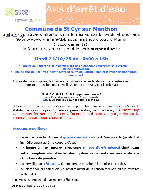 Suite à des travaux effectués sur le réseau, la fourniture d’eau est suspendue sur les habitations situées sur la route des Couardes, la route de Bourbouillon et une partie de la route de Mâcon.