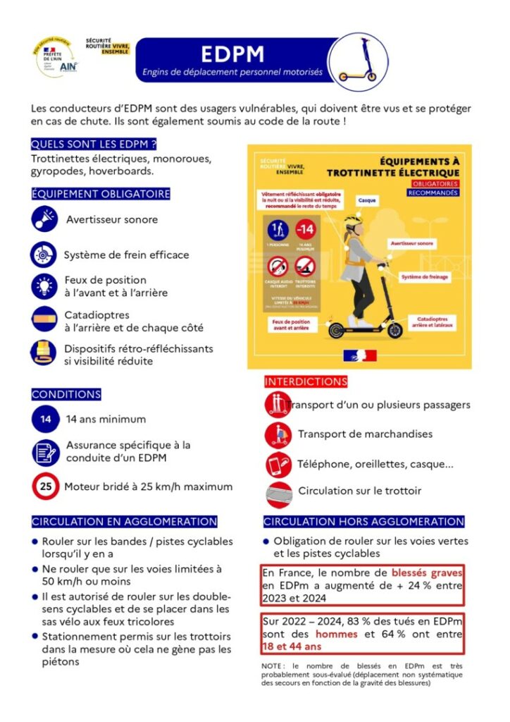 La préfecture de l’Ain rappelle les règles de sécurité destinée aux conducteurs de trottinette électrique : votre engin doit obligatoirement comporter des feux avant et arrière, un klaxon, des freins efficaces et des dispositifs réfléchissants, un vêtement réfléchissant la nuit. Le port du casque, bien que non obligatoire, reste vivement conseillé et il est interdit de circuler sur les trottoirs, de dépasser 25 km/h ou de transporter un passager. Les moins de 14 ans n’ont pas le droit de conduire ces véhicules.