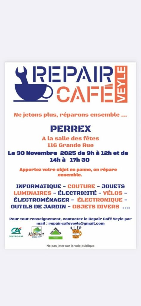 La prochaine session de réparation du Repair Café Veyle aura lieu le Dimanche 30 Novembre 2025 à la salle des fêtes de Perrex.